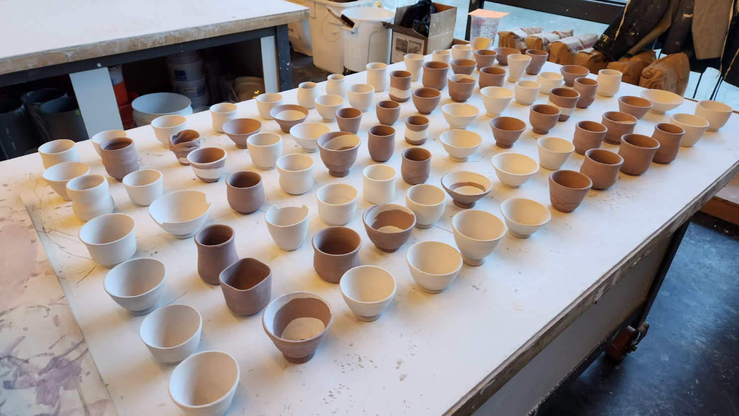For Personal Statements, I wanted to go big (since I couldn’t go home). I generally am pretty risk-averse when I throw, and I wanted to release myself from that pressure of perfection by committing to throwing 100 tea cups—more pieces than I’ve ever made in my last three years as a hobbyist ceramist. I also knew that Personal Statements Night brings in a lot of guests, and I wanted to be able to engage with everyone–and what better way than by serving something out of the cups themselves?
