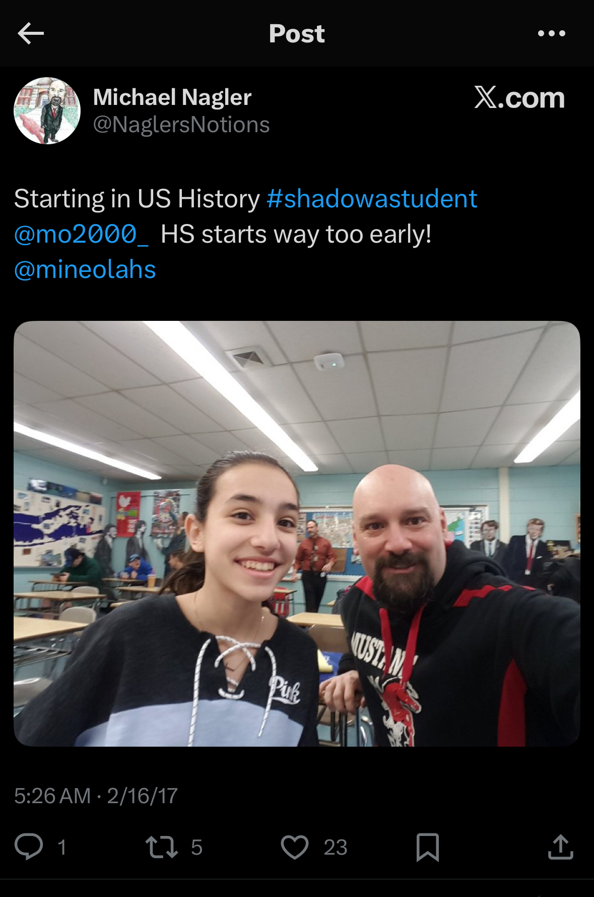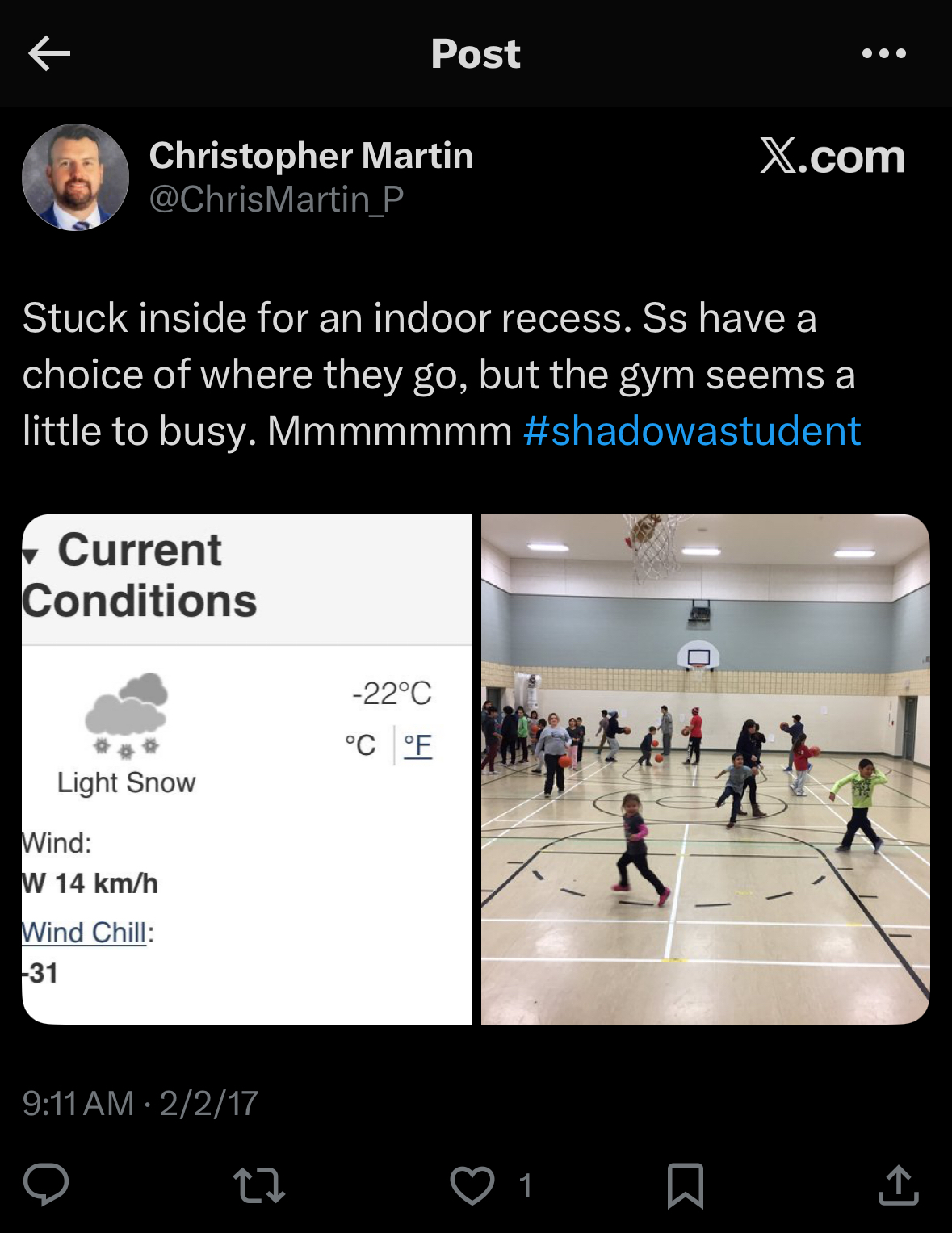 Marjorie Mills Public School principal Chris Martin took the Shadow a Student Challenge in 2016 and returned to the Challenge again in 2017. While he was impressed by the fantastic work of his teachers, when recess came around he realized how having outdoor recess in the frigid Ontario winters proved grueling for his students or staff. After his Shadow Day, he and his team took action and split the 30 minute afternoon recess to 10 minutes in the morning and 20 minutes in the afternoon. They also opened up the computer lab, which has become popular hot spot for students who want to have more agency over where they spend their free time. Inspired by the results, Chris and his team will be trying different hacks to make school better for their students.
